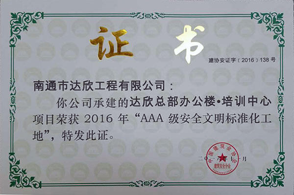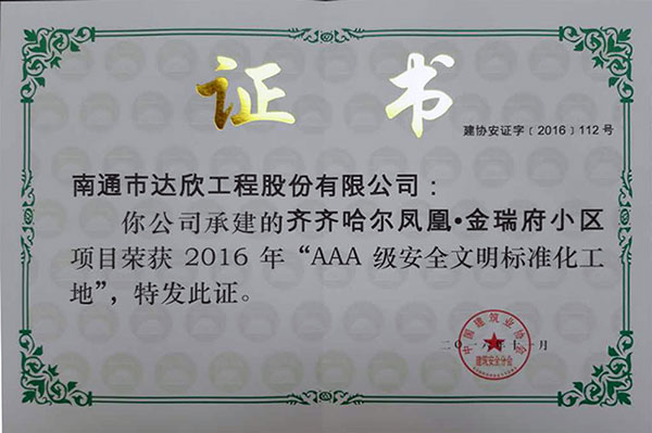 近幾年我公司獲得全國AAA級(jí)安全文明標(biāo)準(zhǔn)化工地23項(xiàng),創(chuàng)建面涉及上海、江蘇、河北、黑龍江、湖南、新疆等市場,榮譽(yù)的取得為進(jìn)一步提升達(dá)欣在全國各個(gè)市場的影響力,促進(jìn)企業(yè)健康發(fā)展奠定堅(jiān)實(shí)的品牌基礎(chǔ)。