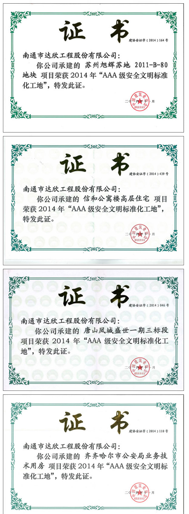 近幾年我公司獲得全國(guó)AAA級(jí)安全文明標(biāo)準(zhǔn)化工地16項(xiàng),創(chuàng)建面涉及上海、江蘇、湖南、河北、黑龍江、新疆等市場(chǎng),安全文明施工管理水平再上新臺(tái)階,榮譽(yù)的取得為進(jìn)一步提升達(dá)欣品牌在全國(guó)各個(gè)市場(chǎng)的影響力,為進(jìn)一步提升企業(yè)形象、促進(jìn)企業(yè)長(zhǎng)遠(yuǎn)發(fā)展奠定堅(jiān)實(shí)的品牌基礎(chǔ)。