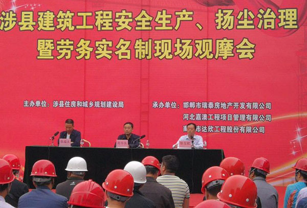 住建局局長張玉斌對(duì)我公司在御湖天城建筑安全施工、揚(yáng)塵整治暨勞務(wù)實(shí)名制的做法,給予高度肯定。 他表示,我們公司在安全管理、揚(yáng)塵治理及勞務(wù)實(shí)名制的做法為涉縣其他各單位的現(xiàn)場(chǎng)安全管理、揚(yáng)塵治理及有效地維護(hù)農(nóng)民工權(quán)益指明了方向和途徑。