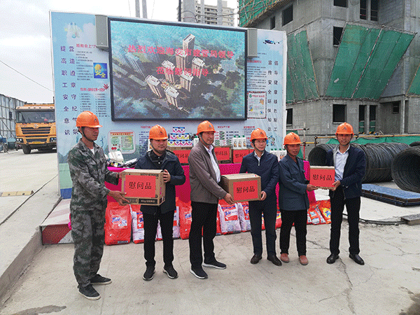 工程公司指導(dǎo)員徐修同對賈局長一行的到來表示熱烈的歡迎。隨后,賈局長一行參觀了項目施工現(xiàn)場,徐修同就君豪項目做了簡單介紹。賈局長對施工現(xiàn)場各項工作的有序開展表示充分肯定,同時叮囑項目管理人員不僅要保證工程質(zhì)量、安全和進(jìn)度,還要切實保障建筑工人的合法權(quán)益,關(guān)心建筑工人的工作與生活。最后賈局長一行將慰問品發(fā)放到工人的手中。