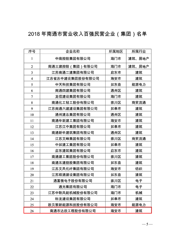 4月23日,南通市工業(yè)和信息化局發(fā)布關(guān)于2018年南通市營業(yè)收入百強民營企業(yè)(集團)情況的通報。南通市達欣工程股份有限公司以出色的業(yè)績榮登百強企業(yè)榜單,列26位,排名海安第5位(海安共有26家入圍)。