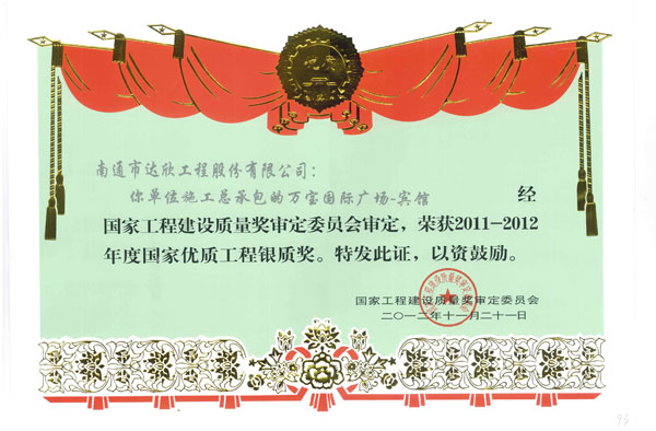 我公司總承包施工的上海“萬(wàn)寶國(guó)際廣場(chǎng)-賓館”作為主申報(bào)單位,在先后獲得上海市“節(jié)約型”樣板工地、上海市優(yōu)質(zhì)結(jié)構(gòu)工程、上海市“白玉蘭”優(yōu)質(zhì)工程后,經(jīng)上海市建筑施工行業(yè)協(xié)會(huì)推薦,經(jīng)國(guó)優(yōu)專家組現(xiàn)場(chǎng)檢查,評(píng)審委員會(huì)評(píng)審,最終榮獲了2011-2012年度國(guó)家優(yōu)質(zhì)工程銀質(zhì)獎(jiǎng)。上海萬(wàn)寶國(guó)際廣場(chǎng)-賓館項(xiàng)目是自公司易名以來,首次以“達(dá)欣股份”為主體的總承包申報(bào)項(xiàng)目。