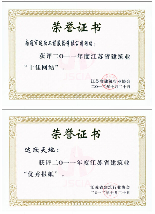 會(huì)議同時(shí)對(duì)2011年度江蘇省建筑業(yè)優(yōu)秀報(bào)、刊、網(wǎng)和優(yōu)秀通訊員進(jìn)行了表彰,南通市達(dá)欣工程股份有限公司網(wǎng)站榮獲江蘇省建筑業(yè)“十佳網(wǎng)站”、“達(dá)欣天地”報(bào)榮獲江蘇省建筑業(yè)“優(yōu)秀報(bào)紙”。