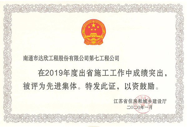 江蘇省住房和城鄉(xiāng)建設(shè)廳公布了“2019年度江蘇出省施工企業(yè)先進集體和先進個人的通報”。第七工程公司榮獲“2019年度江蘇出省施工企業(yè)先進集體”,陳貴榮同志被評為“江蘇出省施工先進個人”。