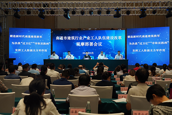 9月17日上午,南通市建筑行業(yè)產(chǎn)業(yè)工人隊(duì)伍建設(shè)改革觀摩部署會(huì)在達(dá)欣集團(tuán)舉行。南通市總工會(huì)黨組書記、副主席、產(chǎn)業(yè)工人隊(duì)伍建設(shè)改革聯(lián)席會(huì)議辦公室主任葛志娟,南通市住房和城鄉(xiāng)建設(shè)局黨組副書記、副局長(zhǎng)、一級(jí)調(diào)研員沈衛(wèi)星,南通市總工會(huì)四級(jí)調(diào)研員楊紅衛(wèi);各(縣)市、區(qū)總工會(huì)領(lǐng)導(dǎo)、勞動(dòng)和經(jīng)濟(jì)工作部部長(zhǎng),以及南通市建筑施工特級(jí)資質(zhì)企業(yè)、海安市建筑施工一級(jí)資質(zhì)企業(yè)負(fù)責(zé)產(chǎn)改的主要領(lǐng)導(dǎo)等120多人參加觀摩會(huì)。海安市委常委、組織部部長(zhǎng)、統(tǒng)戰(zhàn)部部長(zhǎng)張明星,海安市政協(xié)副主席、總工會(huì)主席李如生;海安市總工會(huì)黨組書記、副主席柴寶清,海安市建管局局長(zhǎng)賈伯根等陪同參加;集團(tuán)董事長(zhǎng)馬和軍,黨委書記劉厚純,副總經(jīng)理、工會(huì)主席溫鶴華參加活動(dòng)。