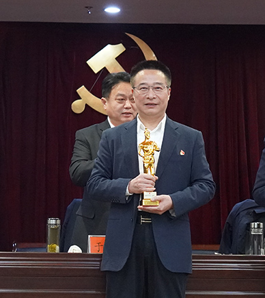 會上,集團黨委書記劉厚純上臺接受表彰,領取了黨建“魯班獎”小金人獎杯。