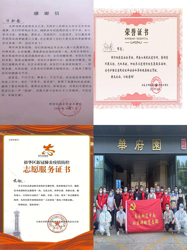 近日,第四工程公司陸續(xù)收到來自石家莊橋區(qū)西區(qū)南長街道辦事處、裕華區(qū)精神文明建設(shè)委員會對馬和春、花敏等同志的感謝信,對他們在石家莊市疫情期間,主動請纓加入志愿者隊伍,不懼風(fēng)險、知難而進,為社區(qū)物資配送、核酸檢測、信息統(tǒng)計、環(huán)境消殺、防控措施宣傳等方面所做的貢獻和展現(xiàn)出的舍小家為大家的無私、擔(dān)當(dāng)、奉獻精神表示感謝。