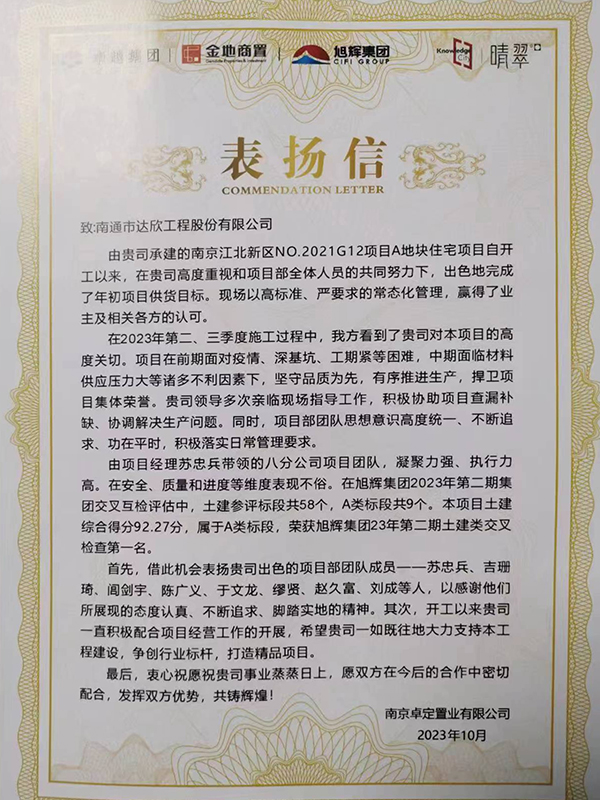 近日,公司收到南京卓定置業(yè)有限公司發(fā)來(lái)的表?yè)P(yáng)信,對(duì)公司南京G12項(xiàng)目管理團(tuán)隊(duì)出色完成年初項(xiàng)目預(yù)期目標(biāo),以及在項(xiàng)目建設(shè)中表現(xiàn)出的專(zhuān)業(yè)、認(rèn)真、負(fù)責(zé)的態(tài)度,不畏困難、迎難而上的精神,高標(biāo)準(zhǔn)、嚴(yán)要求的工作作風(fēng)提出贊揚(yáng)和認(rèn)可。此外,該項(xiàng)目在旭輝集團(tuán)2023年第二期土建類(lèi)檢查中榮獲第一名的好成績(jī)。