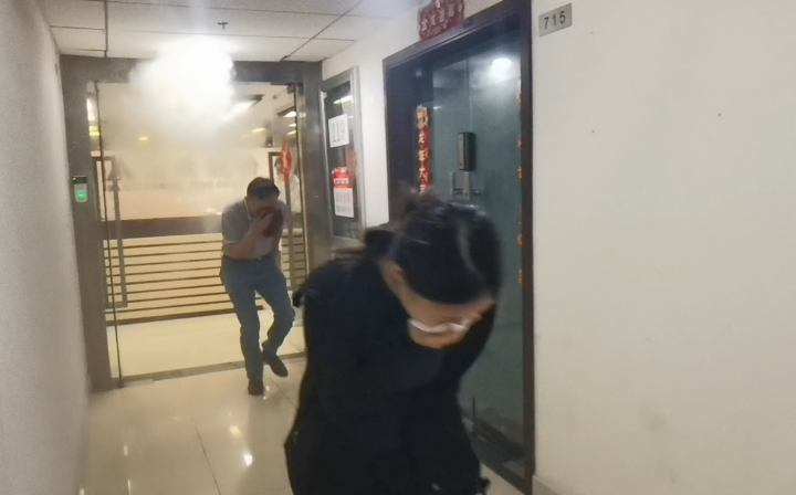 現(xiàn)場從發(fā)現(xiàn)著火點(diǎn)、報(bào)警、疏散人員等情景開展模擬演練。隨著火警警報(bào)的響起,在場人員立即按照預(yù)先制定的疏散方案行動。大家迅速采取“彎腰低頭、捂鼻貼墻”的逃生姿勢,在疏散過程中,大家保持冷靜,有序地沿著疏散通道向室外撤離。