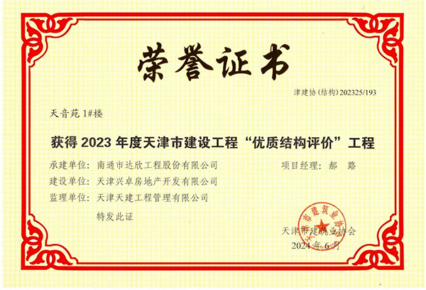 近日,由第六工程公司承建的天音苑1#樓榮獲“2023年度天津市建設(shè)工程“優(yōu)質(zhì)結(jié)構(gòu)評(píng)價(jià)”工程。