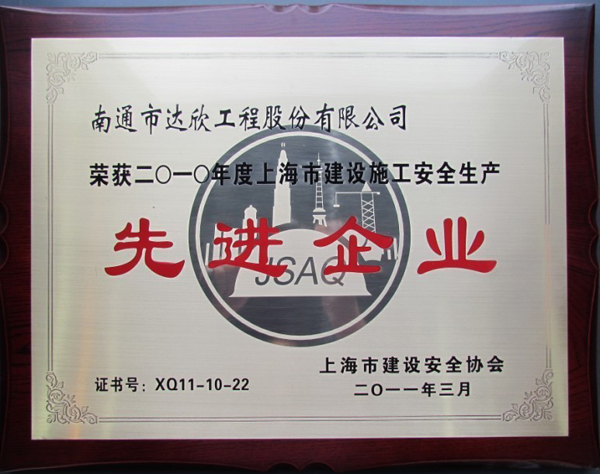 日前南通市達(dá)欣工程股份有限公司被上海市建筑安全協(xié)會評為“二0一0年度上海市建設(shè)施工安全生產(chǎn)先進(jìn)企業(yè)”。這是第一工程公司連續(xù)四年獲此殊榮。
