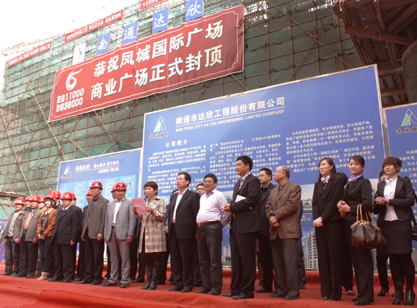 在4月15日的裙樓封頂儀式上,唐山天壤房地產(chǎn)開發(fā)有限公司闞春鳳董事長首先向全體參建人員表示衷心的感謝,對達欣公司在工程建設中所做的努力給予高度評價和充分肯定,她在最后致詞中堅信:在達欣股份等諸多品牌公司的通力協(xié)作之下,在全體參建人員的共同努力下,鳳城國際廣場項目一定會如期完成。