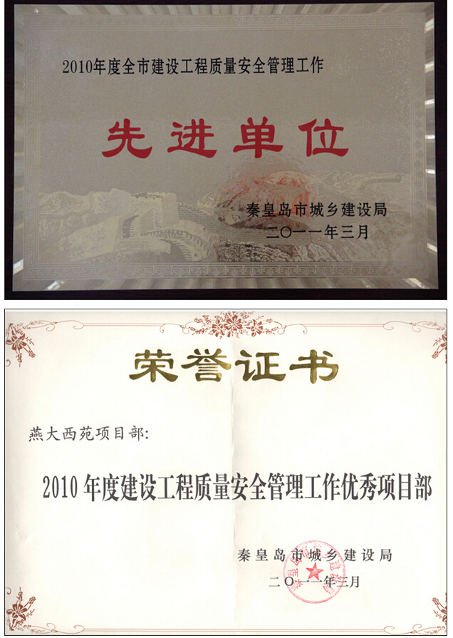2011年3月8日,秦皇島市城鄉(xiāng)建設(shè)局召開2010年度全市建設(shè)工程質(zhì)量安全管理工作先進(jìn)單位和先進(jìn)個人表彰大會:第三工程公司獲2010年度秦皇島市建設(shè)工程質(zhì)量安全管理工作先進(jìn)單位;燕大西苑三標(biāo)段項目部獲優(yōu)秀項目部;燕大西苑三標(biāo)段項目經(jīng)理楊禮虎獲優(yōu)秀項目經(jīng)理。