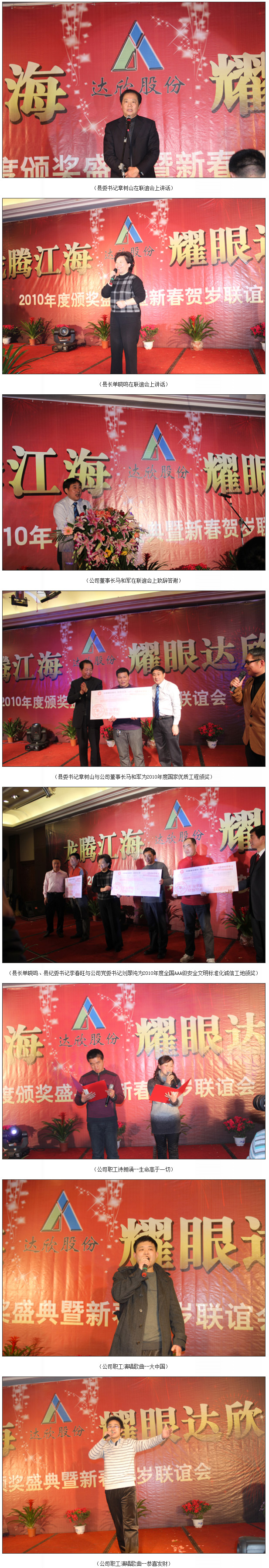 在喜慶樂典和主持人高亢激昂的道白后,首先回睦了2010年公司精彩的展示專題片,公司董事長馬和軍隨后進(jìn)行了致辭答謝。他回顧了公司一年來所取得的輝煌成績,感謝社會各界及公司全體同仁們的努力,并對公司的未來發(fā)展之路描繪了藍(lán)圖;接著,縣委書記章樹山發(fā)表重要講話,他指出,建筑業(yè)是我縣的傳統(tǒng)產(chǎn)業(yè),也是一個富民強(qiáng)勢產(chǎn)業(yè),還是我縣財政收入的重要來源之一,作為縣內(nèi)的骨干企業(yè),達(dá)欣公司步入了公司歷史以來發(fā)展最快、榮譽(yù)最高、分配最多、貢獻(xiàn)最大的時期,他希望公司要加快發(fā)展,高起點(diǎn)定位,突出重點(diǎn),好中求快,實(shí)現(xiàn)達(dá)欣新飛躍。