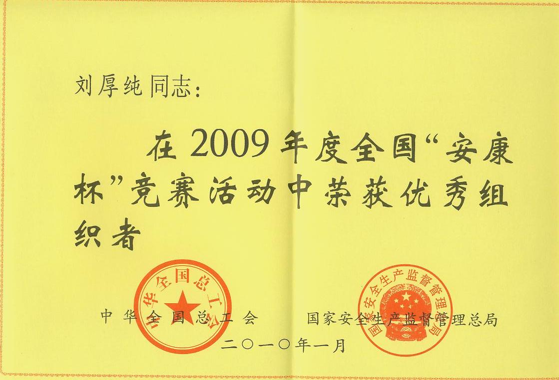中華全國總工會、國家安全生產監(jiān)督管理總局聯(lián)合發(fā)文,公司黨委書記、副董事長劉厚純獲得2009年度全國“安康杯”競賽活動優(yōu)秀組織者稱號。