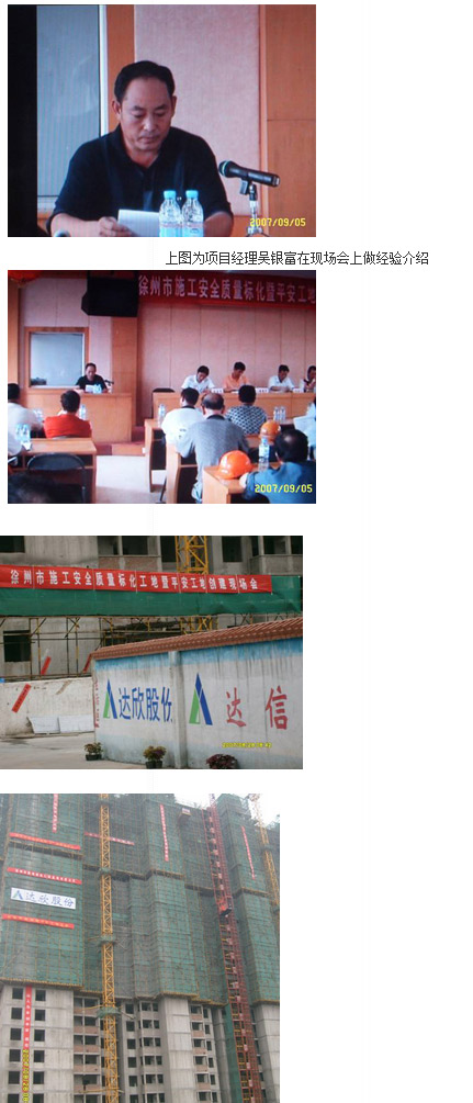 大會上吳經(jīng)理的發(fā)言得到了大家一次又一次的掌聲,建設(shè)局安監(jiān)處王處長最后對這次的現(xiàn)場會作了很高的評價。通過這一次的活動,極大的提高了“達欣股份”在徐州建筑市場的知名度,為“達欣股份”進軍強手之林奠定了基石,提升了我們的品牌形象。