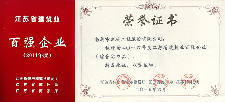 為充分發(fā)揮優(yōu)勢(shì)企業(yè)在全行業(yè)中的引領(lǐng)和示范作用,打造建筑企業(yè)品牌,提升核心競(jìng)爭(zhēng)力,省住房城鄉(xiāng)建設(shè)廳、統(tǒng)計(jì)局、商務(wù)廳成立了“百?gòu)?qiáng)企業(yè)”認(rèn)定委員會(huì),本著“尊重事實(shí)、嚴(yán)格標(biāo)準(zhǔn)、規(guī)范程序、公平公正”的原則,組織開(kāi)展了2014年度建筑業(yè)“百?gòu)?qiáng)企業(yè)”(企業(yè)包括總承包綜合實(shí)力類、建筑裝飾裝修類、建筑鋼結(jié)構(gòu)類、建筑安裝類、基礎(chǔ)設(shè)施類等)認(rèn)定工作。經(jīng)評(píng)議,公司首度榮登2014年江蘇省建筑業(yè)“百?gòu)?qiáng)企業(yè)”。按照《江蘇省建筑業(yè)企業(yè)信用綜合評(píng)價(jià)辦法》(蘇建建管〔2013〕602號(hào))文件精神,自發(fā)布之日起的一年內(nèi),“百?gòu)?qiáng)企業(yè)”可在施工企業(yè)信用考評(píng)中做為省級(jí)獎(jiǎng)項(xiàng)予以加分。